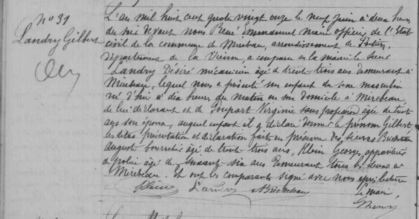 Généalogie de Gilbert Landry à compléter. Enregistrement de naissance le 9 juin 1891