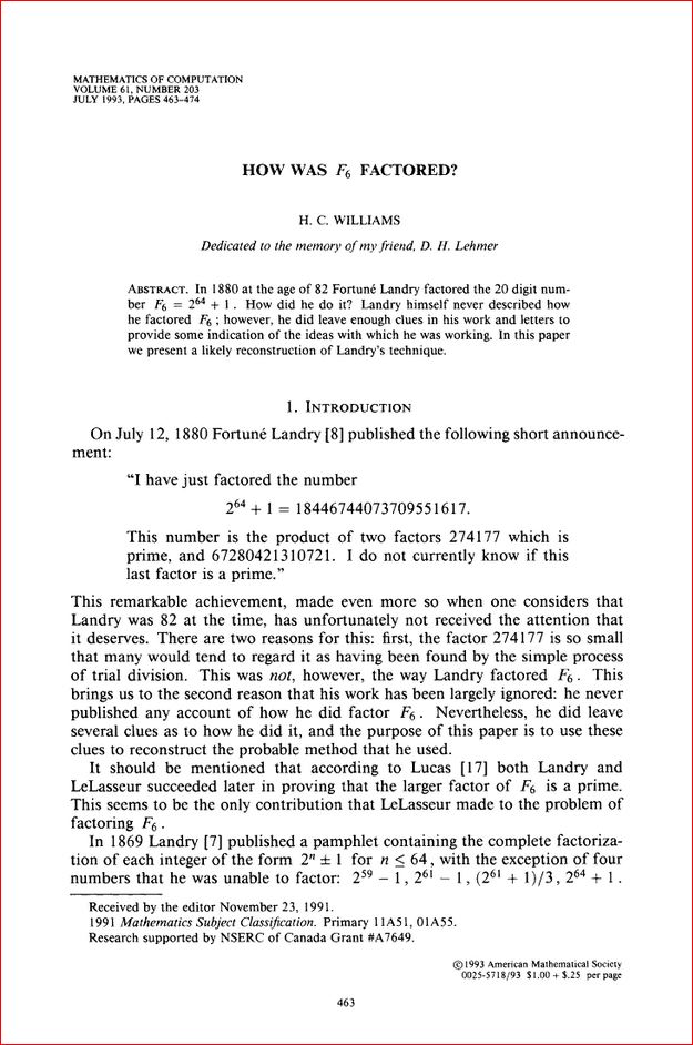 En 1869 : "This is an example of an Aurifeuillian factorization, named after Léon François Antoine Aurifeuille, who discovered a special case in 1873: 24m − 2 + 1 = (22m − 1 + 2m + 1)(22m − 1 − 2m + 1) Knowledge of this factorization would have saved the many years of his life that Fortuné Landry spent factoring 258 + 1, finally finishing in 1869. Landry’s gargantuan factorization is just a trivial special case! 258 + 1 = (229 + 215 + 1)(229 − 215 + 1)" Source: David Wells Prime Number. http://lib.baidu.jp/view/a15f33687e21af45b307a81d.html