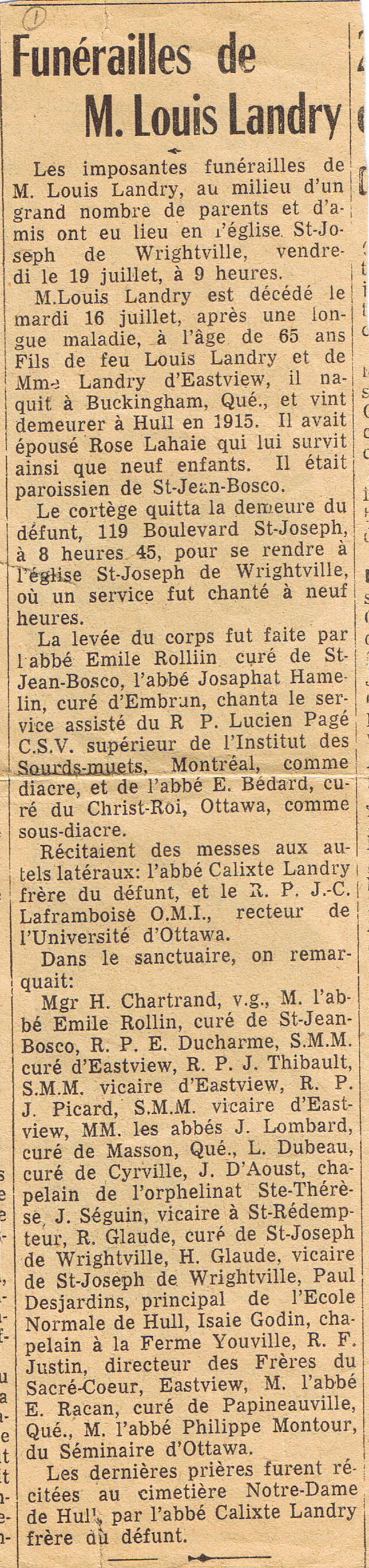 16-19 juillet 1946 La liste des participants aux funérailles de Louis est impressionnante. Participaient aux funérailles, le recteur de l'Université d'Ottawa, le Supérieur de l'Institut des Sourds-muets de Montréal, le Principal de l'École Normale de Hull, le directeur des Frères du Sacré-Coeur et un grand nombre de curés et abbés de la région. La messe solennelle avec diacres et sous-diacres est célébrée entre autres par son cousin Josaphat Hamelin et à un autel latéral par son frère Calixte Landry.