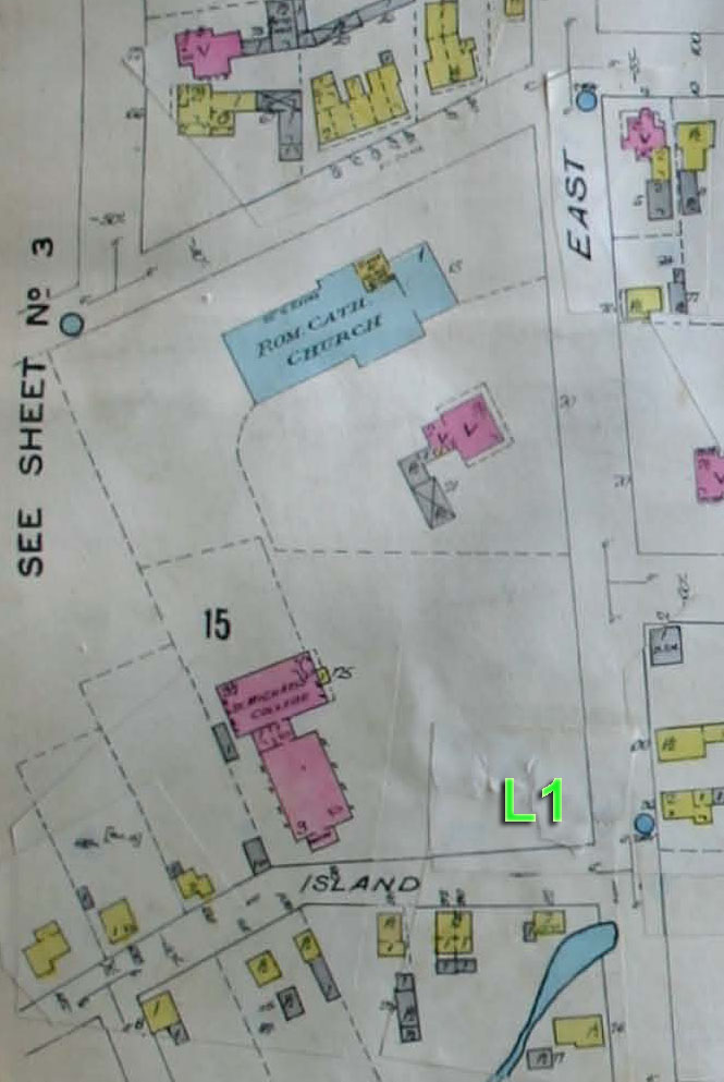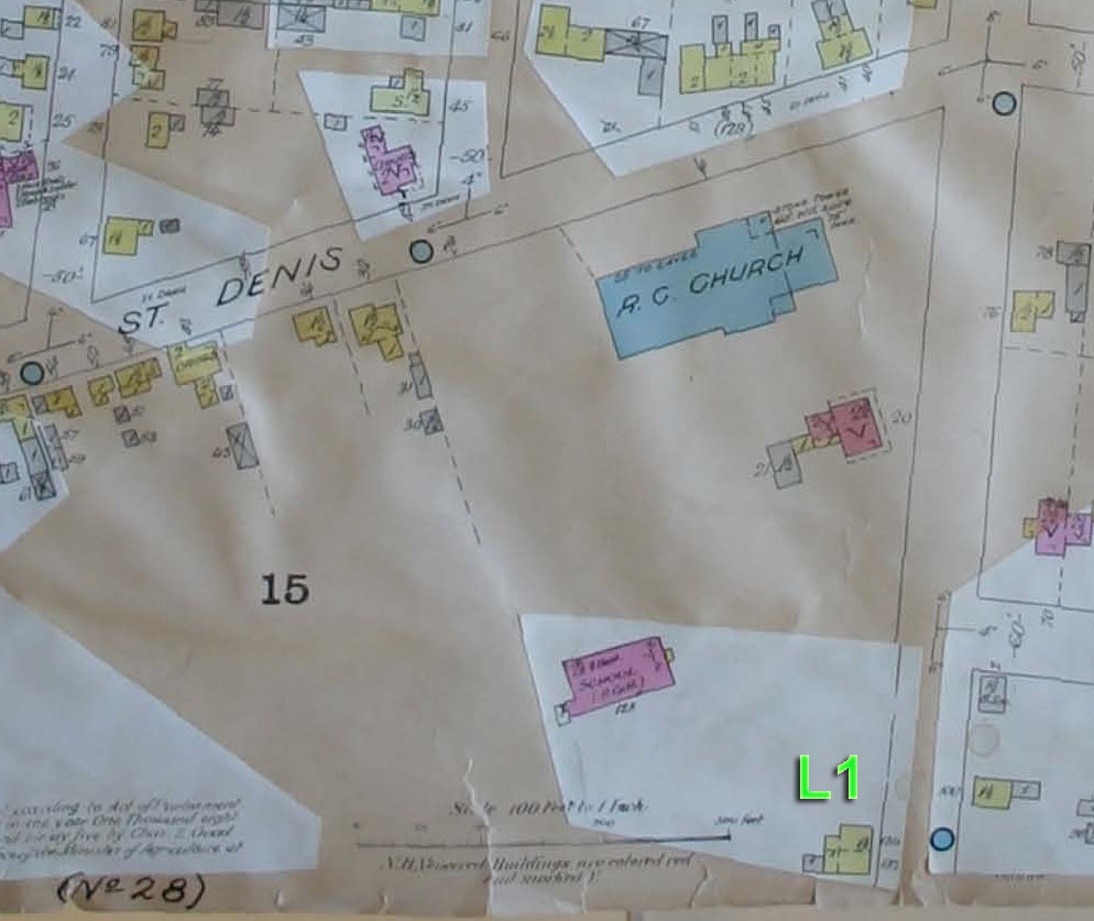 Plan de localisation du Magasin général de Laure Daoust Landry et ses enfants. Veuve Louis Landry, père. Le Magasin Général sur la rue East aujourd'hui, rue Bélanger, coin Island aujourd'hui Lamenais (Sigle L1). Il s'agit d'une maison de bois car en jaune sur le plan. Plan de juillet 1895 révisé à décembre 1902
