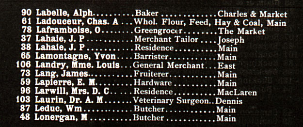 Annuaire téléphonique de Bell Canada pour le District of Quebec, juin 1907, section sur Buckingham, page 38. On voit ici le Magasin général de la veuve de Louis Landry sur la rue East. Il sera aussi dans l'annuaire de 1908, mais absent à partir de 1909.