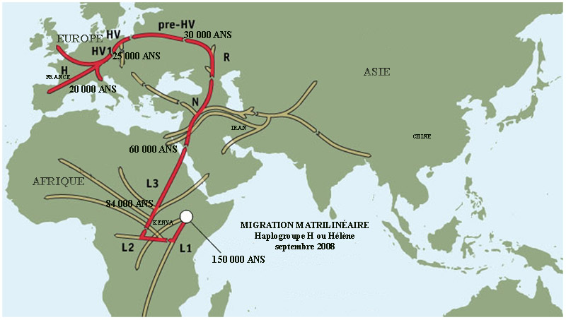Depuis plus de 200 000 ans les humains vivent au centre de l'Afrique. Un femme naîtra il y a 150 000 ans qui donnera son ADN mitochondrial à l'ensemble des femmes et des hommes sur la terre aujourd'hui. À noter que les hommes possède un ADN mitochondrial, mais seul les femmes le transmette à leurs enfants. Il y a 84 000 ans des descendants commencent une lente migration vers le nord et quittent l'Afrique il y 60 000 ans. Ils poursuivent cette marche pour atteindre l'Europe de l'est vers 30 000 ans puis ils se dirigent vers l'ouest en direction de l'Europe. C'est l'époque de l'arrivée des hommes de Cro-Magnon en Europe et la disparition des hommes de Neandertal qui occupaient l'Europe depuis 100 000 ans. Il y a 20 000 ans ils occupent la plus grande partie de l'Europe de l'ouest. Avec le recul des glaces de la dernière période glacière, ils contribueront au peuplement de l'Europe de l'ouest pendant des milliers d'année et représentent aujourd'hui près de 45% des femmes et des hommes de France. De ces enfants naîtra Madeleine Gaumond à Paris en 1646 qui comme fille du roi immigrera au Canada et deviendra l'ancêtre mitochondrial d'un très grand nombre de personnes au Canada et aux États-Unis.