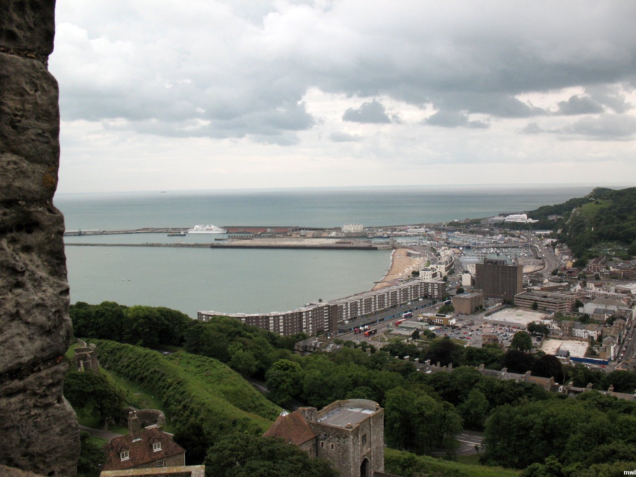 jeudi, 14 juillet 2011, 12h21 | Le château de Douvres | Ville: Douvres - Dover | Kent | Angleterre | Le Château de Douvres est situé sur une colline dominant la Manche, au nord-est du port de Douvres, comté de Kent en Angleterre. Ce château possède un grand avantage : c'est le point d'Angleterre le plus proche du continent européen. Les Romains érigèrent un phare qui se dresse toujours dans l'enceinte du château. Guillaume le Conquérant a étendu des fortifications existantes à cet endroit en 1066. | GPS: 51°7'46.30" N | 1°19'16.40" E | © Cécile Brousseau | Fichier: IMG_4729.JPG