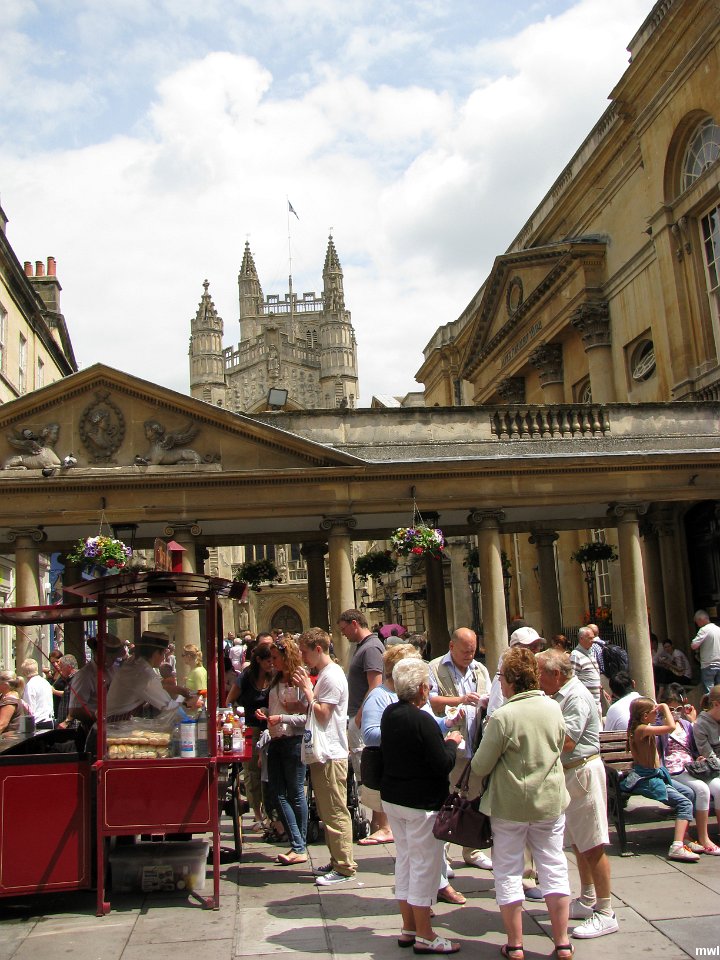 mercredi, 13 juillet 2011, 13h35 | Un hot dog et un cola à la course avant de repartir | Ville: Stonehenge Bath Startford-upon-A | Angleterre | En 43 av. J.-C, les Romains fondèrent la ville pour en faire un lieu thermal et s'appelait en latin Aquae Sulis ("les eaux de Sulis"). Cependant, la tradition orale semble suggérer que Bath était connue avant cette date. Ils construisirent des bains et un temple dans les collines aux alentours de la ville, dans la vallée de l'Avon autour de sources chaudes. Edgar d'Angleterre fut proclamé roi à l'abbaye de Bath en 973. Bien plus tard, la ville devint populaire en tant que station thermale pendant l'époque georgienne, qui conduit à une importante expansion laissant un incroyable héritage architectural fabriqué avec la pierre de la région. Source: Wiki. | GPS: 51°22'52.61" N | 2°21'36.74" W | © Marcel Walter Landry | Fichier: IMG_8179.JPG