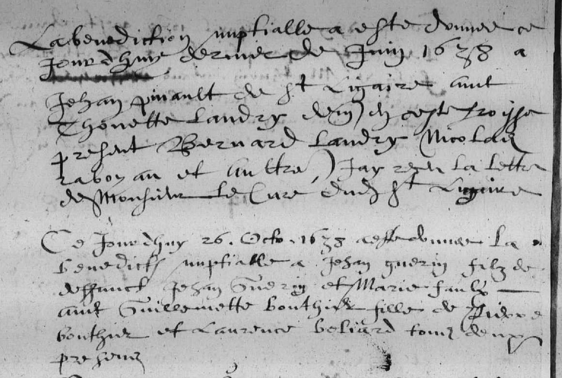 Mariage avant 1697 à Mauprévoir de Pierre Landry (M ) et Jeanne Ferron |
