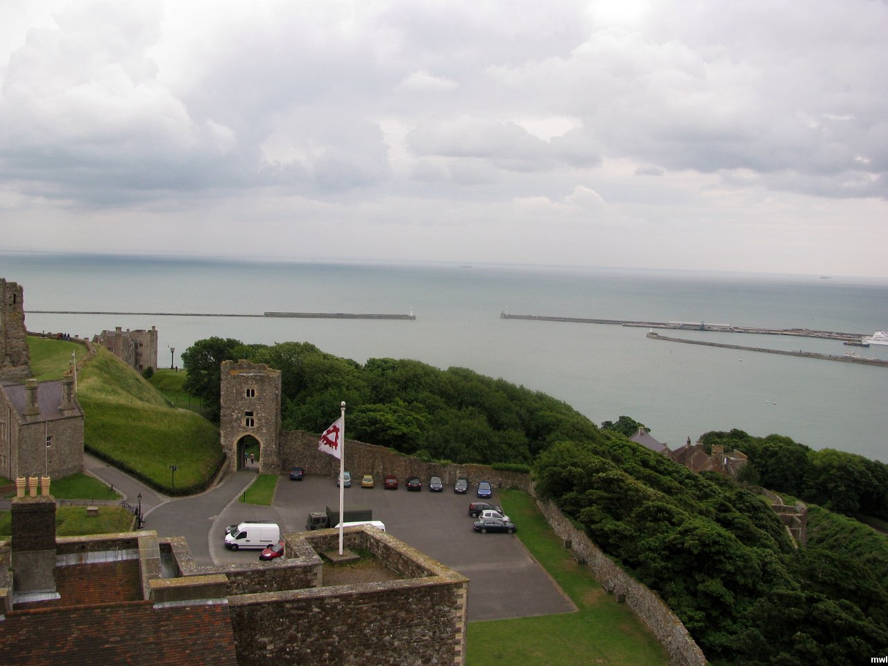 jeudi, 14 juillet 2011, 12h22 | Le château de Douvres | Ville: Douvres - Dover | Kent | Angleterre | Le Château de Douvres est situé sur une colline dominant la Manche, au nord-est du port de Douvres, comté de Kent en Angleterre. Ce château possède un grand avantage : c'est le point d'Angleterre le plus proche du continent européen. Les Romains érigèrent un phare qui se dresse toujours dans l'enceinte du château. Guillaume le Conquérant a étendu des fortifications existantes à cet endroit en 1066. | GPS: 51°7'46.25" N | 1°19'16.85" E | © Marcel Walter Landry | Fichier: IMG_8253.JPG