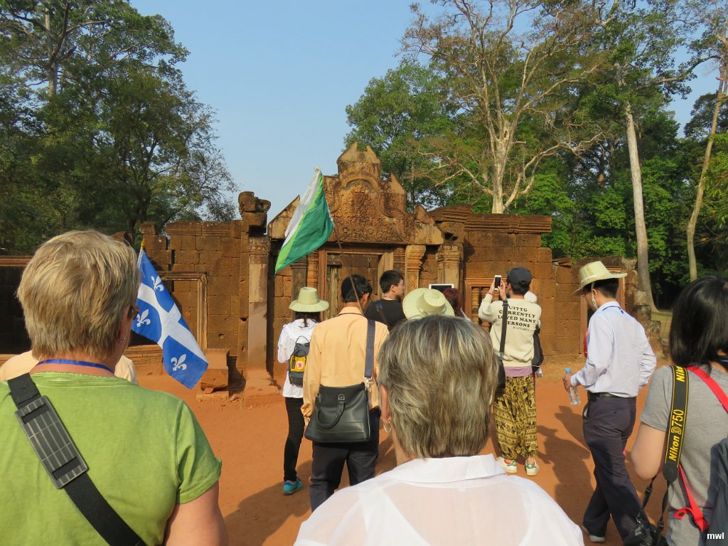 mercredi, 10 février 2016, 8 h 37 | Ville: Siem Reap | Angkor | Cambodge | Banteay Srei, appelé la « Citadelle des Femmes ». Ce très beau temple de granite rose est situé à 25 km de Siem Reap. C'est l'un des temples mythiques du site devenu célèbre après l'aventure d'André Malraux. Un vrai bijou dart khmer dont les façades sont gravées dune multitude de motifs raffinés comme de la dentelle. Dans sa cour intérieure, plusieurs pavillons bien conservés sont gardés par des singes de pierre. | GPS: 13°35'55.90" N | 103°57'52.28" E | © Marcel Walter Landry | Fichier: IMG_2757.JPG