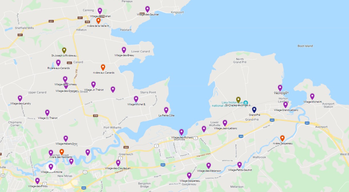 Carte moderne indiquant l'emplacement des villages mentionnés dans la liste de Winslow. Nom de lieu surtout basé sur l'excellente carte du site : Déportation des Acadiens: la liste de Winslow expliquée sur ce site. Au besoin une copie de la carte de l'article est ici.