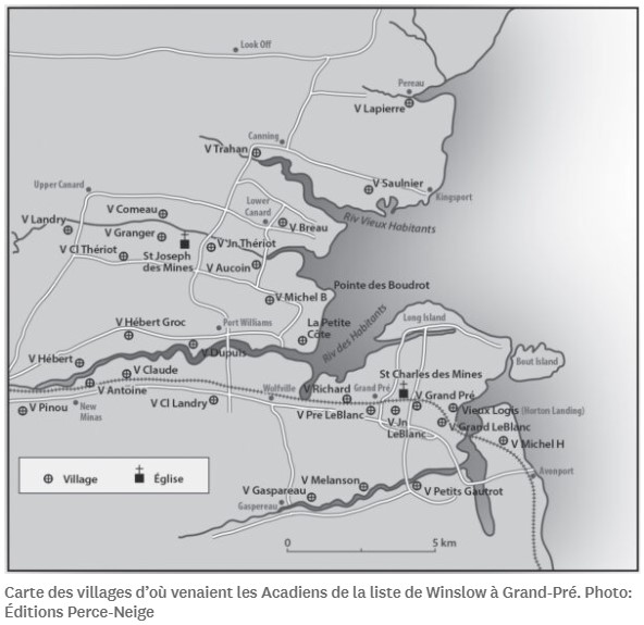 Grand Pre, le 13 septembre 1755. Ceci est pour certifier que la liste précédente, avec le nombre des Habitants, de leurs enfants, bétail, etc., ainsi que le nom de plusieurs villages, m'a été donnée par Francis Landry et par d'autres, entre leurs réunions, comme je les avais sommés de le faire, du 5 septembre à ce jour. L'original a été remis audit Francis Landry après que je l'aie transcrite dans mon livre, avec ce certificat dument signé. John Winslow