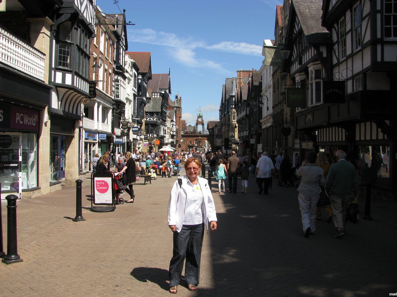 dimanche, 24 juillet 2011, 14h31 | Visite de Chester | Ville: Chester | Pays de Galles | Chester - The city began life in the first century A.D. as Deva, a Roman castra stativa or permanent garrison. Portions of the original Roman walls are still visible. Highlights include the city's historic towers and ancient gates as well as its unique 13th-century "rows," half-timbered galleried shops on two stories. | GPS: 53°11'25.39" N | 2°53'28.35" W | © Marcel Walter Landry | Fichier: IMG_9100.JPG