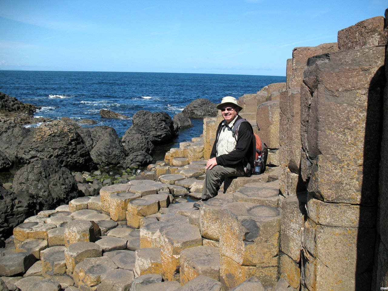 vendredi, 22 juillet 2011, 12h03 | Giants causeway - La Chaussée du Géant | Ville: Giants Causeway | Irlande du Nord | Giant's Causeway. Renowned for its polygonal columns of layered basalt, the Causeway is considered the Eighth Wonder of the World, and is the only World Heritage Site in Northern Ireland. According to myth, the giant Finn McCool used the basalt columns forming the causeway as stepping stones to travel from Ireland to Scotland to visit his lover, a Scots giantess. Scientists, however, believe the mainly hexagonal columns resulted from cooling lava flows. Since it was first documented in 1693, the Causeway Coast has been the subject of much controversy concerning the origins of the earth. | GPS: 55°14'25.62" N | 6°30'41.34" W | © Cécile Brousseau | Fichier: IMG_4901.JPG