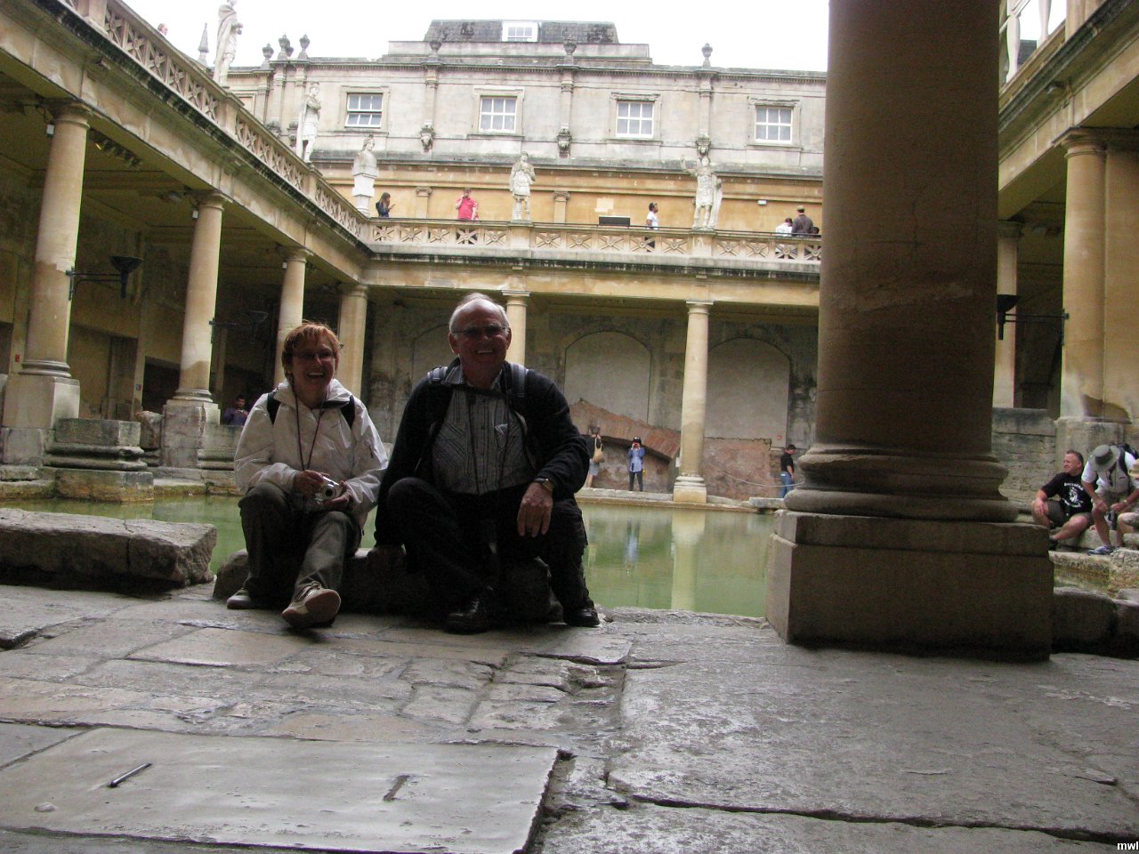 mercredi, 13 juillet 2011, 13h09 | Les bains romains de Bath | Ville: Stonehenge Bath Startford-upon-A | Angleterre | En 43 av. J.-C, les Romains fondèrent la ville pour en faire un lieu thermal et s'appelait en latin Aquae Sulis ("les eaux de Sulis"). Cependant, la tradition orale semble suggérer que Bath était connue avant cette date. Ils construisirent des bains et un temple dans les collines aux alentours de la ville, dans la vallée de l'Avon autour de sources chaudes. Edgar d'Angleterre fut proclamé roi à l'abbaye de Bath en 973. Bien plus tard, la ville devint populaire en tant que station thermale pendant l'époque georgienne, qui conduit à une importante expansion laissant un incroyable héritage architectural fabriqué avec la pierre de la région. Source: Wiki. | GPS: 51°22'51.50" N | 2°21'34.17" W | © Marcel Walter Landry | Fichier: IMG_8167.JPG
