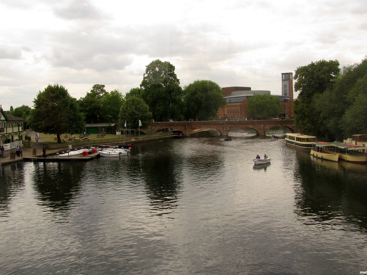 mercredi, 13 juillet 2011, 16h07 | La rivière Avon | Ville: Startford-upon-Avon | Angleterre | Stratford-upon-Avon est une ville du centre de l'Angleterre où William Shakespeare est né en 1564. Il y revint en 1611, assez riche et célèbre pour s'offrir des armoiries et passa les dernières années de sa vie dans sa maison de New Place. Décédé dans cette ville en 1616. | GPS: 52°11'28.49" N | 1°41'58.78" W | © Marcel Walter Landry | Fichier: IMG_8192.JPG