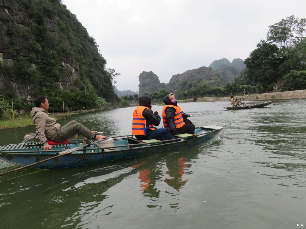 dimanche, 24 janvier 2016, 10 h 55 | Ville: Tam Coc, Ninh Bình | Vietnam | À bord d'une chaloupe avec une rameuse qui rame avec ses pieds, nous traversons un canal bordé de rizières et des grottes qui offrent des paysages de toute beauté. | GPS: 20°13'12.50" N | 105°56'3.30" E | © Marcel Walter Landry | Fichier: IMG_0827.JPG