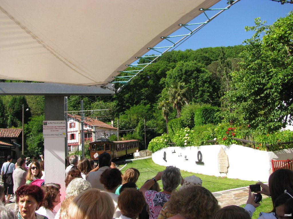 samedi, 30 mai 2009, 10 h 36 | Ville: Sare | Pyrénées-Atlantiques | France | Il est l'un des rares Chemin de fer à crémaillère de France encore en service. Sur une ligne à voie métrique, inaugurée en 1924, roule sur des rames d'époque à traction électrique. La ligne relie le col de Saint-Ignace, à 10 km environ de Saint Jean de Luz entre Ascain et Sare. au sommet de la Rhune à 905 mètres d'altitude, sur la frontière franco-espagnole. | GPS: 43°19'29.58" N | 1°36'2.94" W | ©Marcel Walter Landry | Fichier: IMG_7956.JPG
