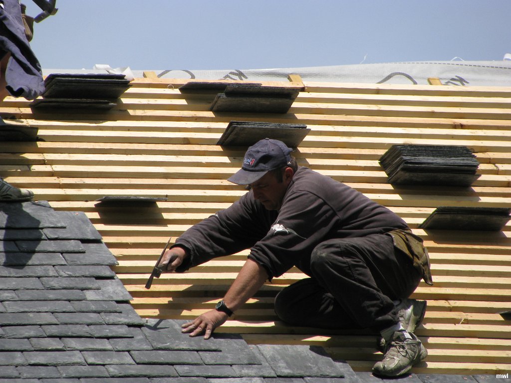 mercredi, 27 mai 2009, 14 h 34 | On refait le toit avec de l'ardoise | Ville: Gavarnie | Hautes-Pyrénées | France | Sur le chemin de St-Jacques de Compostelle. | GPS: 42°43'56.19" N | 0°0'38.49" W | ©Marcel Walter Landry | Fichier: IMG_7788.JPG