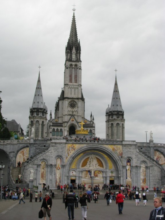 mardi, 26 mai 2009, 17 h 31 | Basilique Notre-Dame-du-Rosaire et basilique de l'Immaculée-Conc | Ville: Lourdes | Hautes-Pyrénées | France | Le bas est la basilique Notre-Dame-du-Rosaire, surmontée d'une deuxième église appelée la basilique de l'Immaculée-Conception au dessus de la petite grotte de Massabielle. | GPS: 43°5'50.38" N | 0°3'19.60" W | ©Marcel Walter Landry | Fichier: IMG_7686.JPG