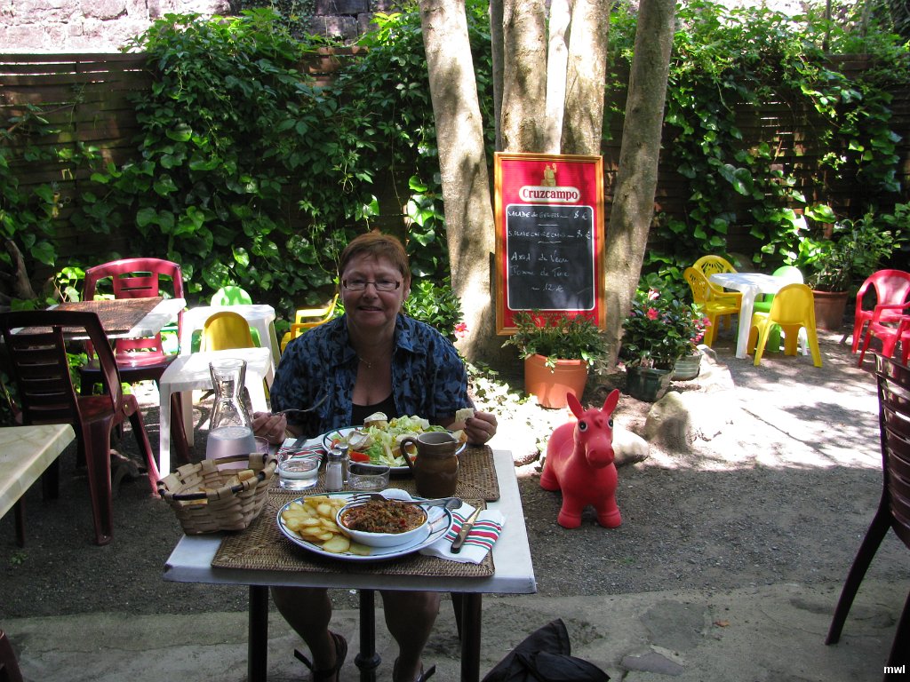 lundi, 1 juin 2009, 12 h 35 | Axoa de veau et salade de chèvre chaud | Ville: St-Jean-Pied-de-Port | Pyrénées-Atlantiques | France | Village du moyen-âge. Lieu préviligié pour un départ de la marche vers St-Jacques de Compostelle. | GPS: 43°9'46.58" N | 1°14'14.54" W | ©Marcel Walter Landry | Fichier: IMG_8185.JPG