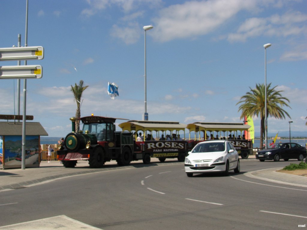 dimanche, 7 juin 2009, 11 h 11 | Train routier faisant des excursions le long de la côte | Ville: Roses | Catalogne | Espagne | GPS: 42°15'53.39" N | 3°10'20.67" E | ©Marcel Walter Landry | Fichier: IMG_8537.JPG