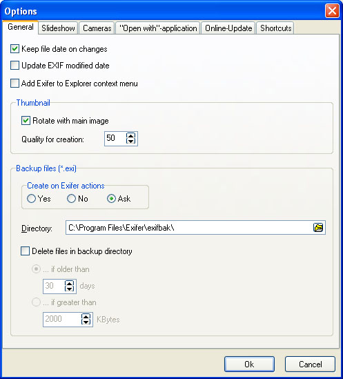 L'information de configuration pour Exifer, du moins dans Windows XP, est classée dans le registre sous la clé HKEY_CURRENT_USER\Software\Exifer. J'ai placé ici mon fichier registre de Exifer en ajoutant l'extension txt par mesure de sécurité. À être utilisé par des connaisseurs seulement.