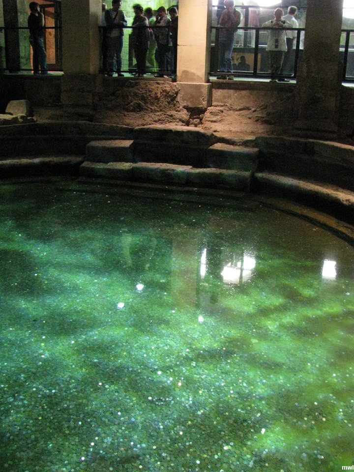 mercredi, 13 juillet 2011, 13h14 | Les bains romains de Bath | Ville: Stonehenge Bath Startford-upon-A | Angleterre | En 43 av. J.-C, les Romains fondèrent la ville pour en faire un lieu thermal et s'appelait en latin Aquae Sulis ("les eaux de Sulis"). Cependant, la tradition orale semble suggérer que Bath était connue avant cette date. Ils construisirent des bains et un temple dans les collines aux alentours de la ville, dans la vallée de l'Avon autour de sources chaudes. Edgar d'Angleterre fut proclamé roi à l'abbaye de Bath en 973. Bien plus tard, la ville devint populaire en tant que station thermale pendant l'époque georgienne, qui conduit à une importante expansion laissant un incroyable héritage architectural fabriqué avec la pierre de la région. Source: Wiki. | GPS: 51°22'51.07" N | 2°21'31.18" W | © Marcel Walter Landry | Fichier: IMG_8171.JPG