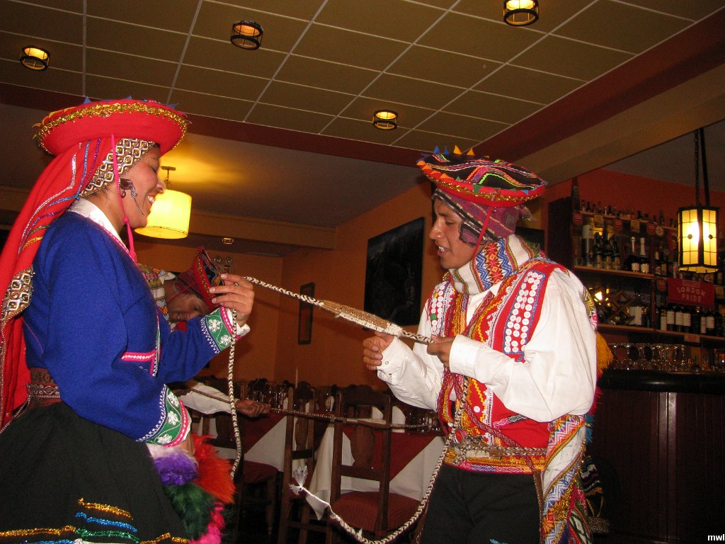mercredi, 3 avril 2013, 20h10 | GPS: 13°30'58.66" S, 71°58'46.05" W | Ville: Cuzco | Pérou | Souper, orchestre et un medley de danses péruviennes. | © Marcel Walter Landry | Photo original: 3264 pixels | 2448 pixels | Fichier: IMG_4311.JPG
