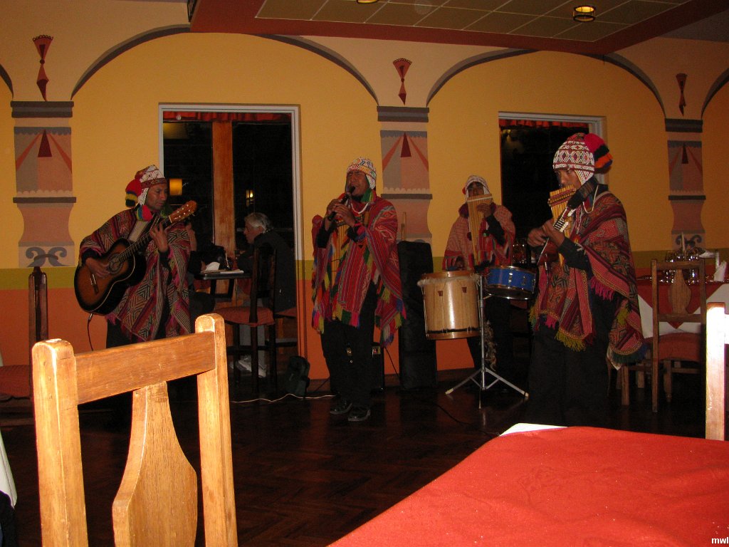 mercredi, 3 avril 2013, 20h23 | GPS: 13°30'58.40" S, 71°58'46.03" W | Ville: Cuzco | Pérou | Souper, orchestre et un medley de danses péruviennes. | © Marcel Walter Landry | Photo original: 3264 pixels | 2448 pixels | Fichier: IMG_4319.JPG