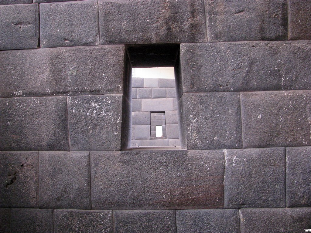 jeudi, 4 avril 2013, 10h24 | GPS: 13°31'12.29" S, 71°58'30.09" W | Allignement parfait des fenêtres | Ville: Cuzco | Pérou | Temple du Soleil, lieu le plus sacré de l'empire des incas, maintenant à l'intérieur du couvent Santo Domingo. | © Marcel Walter Landry | Photo original: 3264 pixels | 2448 pixels | Fichier: IMG_4338.JPG