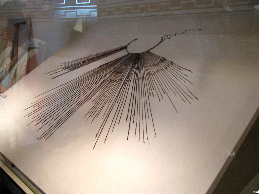 jeudi, 28 mars 2013, 15h56 | GPS: 12°4'37.77" S, 77°3'43.60" W | Quipu - | Ville: Lima | Pérou | En l'absence d'écriture, l'administration figurait les entiers naturels à l'aide de successions de nuds le long de cordelettes de diverses couleurs fixées à une corde : l'ensemble constituait un quipu. | © Marcel Walter Landry | Photo original: 3264 pixels | 2448 pixels | Fichier: IMG_3621.JPG