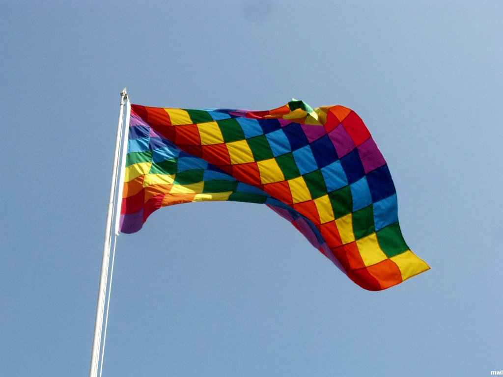 vendredi, 19 avril 2013, 09h29 | GPS: 12°6'55.57" S, 77°1'43.57" W | Le drapeau inca le Wiphala | Ville: Lima | Pérou | Le terme wiphala (ay) désigne les drapeaux rectangulaires aux sept couleurs utilisées par les ethnies des Andes. Il existe de nombreuses variantes. L'une d'elles, considérée comme le drapeau du Collasuyo, est utilisée actuellement comme symbole ethnique du peuple aymara. Wikipédia | © Marcel Walter Landry | Photo original: 3264 pixels | 2448 pixels | Fichier: IMG_5789.JPG