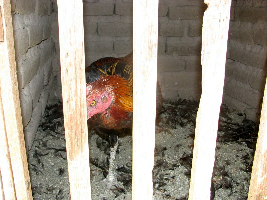 mercredi, 10 avril 2013, 13h56 | GPS: 14°54'51.56" S, 74°59'20.15" W | Des coqs de combat | Ville: Nazca | Pérou | Dîner traditionnel «Pachamanca», qui signifie "cuisine sous terre", dans une ancienne hacienda. L'origine de ce repas remonte à l'époque des Incas. | © Marcel Walter Landry | Photo original: 3264 pixels | 2448 pixels | Fichier: IMG_5131.JPG