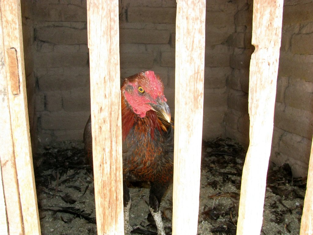 mercredi, 10 avril 2013, 13h56 | GPS: 14°54'51.56" S, 74°59'19.90" W | Des coqs de combat | Ville: Nazca | Pérou | Dîner traditionnel «Pachamanca», qui signifie "cuisine sous terre", dans une ancienne hacienda. L'origine de ce repas remonte à l'époque des Incas. | © Marcel Walter Landry | Photo original: 3264 pixels | 2448 pixels | Fichier: IMG_5132.JPG